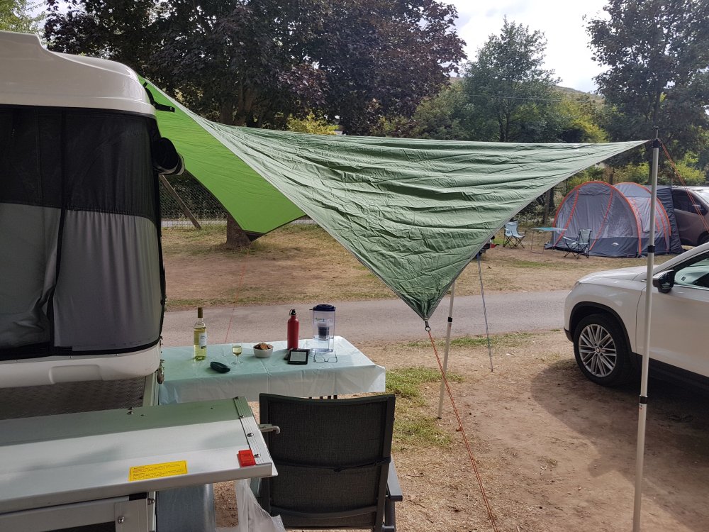 Hab jetzt auch mal das Tarp von der Hängematte als Sonnensegel aufgespannt.